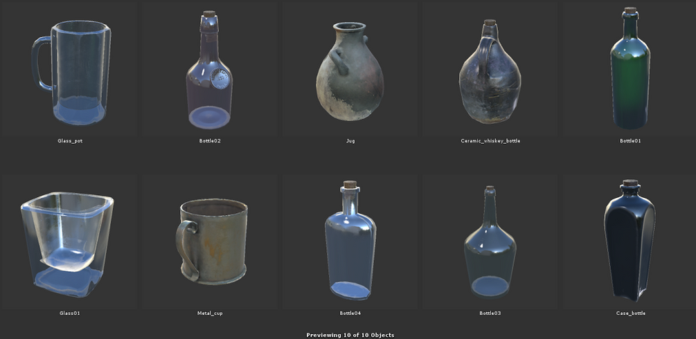 Here is a beautiful collection of (10)ten saloon bottle assets. Sure a shot glass, mug, jug and metal cup are not bottles, but you get the idea. The breakable assets (everything except the metal cup) have a second "pre-shattered" version of the asset so that it is easier to code up for breaking. The jugs and metal cup came directly from my 3D photoscans.