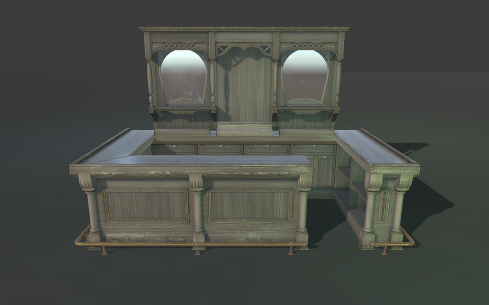 This asset just didn't exist at any level of quality anywhere in the asset store, so we had it made. It's a beautiful piece of work. It is based on two different bar styles from the period. In our game we needed a bar for the drinks to slide off of, so we have broken the bar where the proprietor might enter and exit.